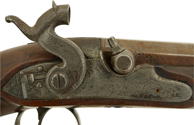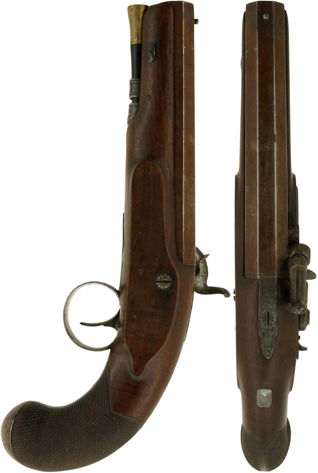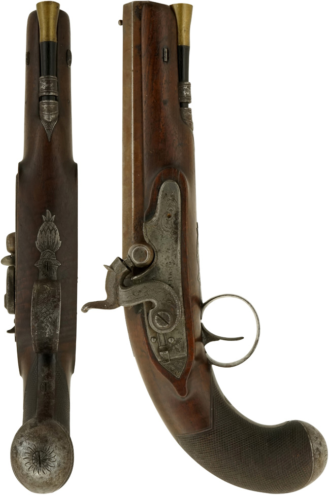 本品は元々フリント・ロック式 (火打石式) 拳銃として製造された品を管打式に改修したものと考えられ、サイド・ロックにはフラッシュ・パンの一部及びフリズン用スプリングの取り付け穴が残されています。 銃身についても火打石式用の銃身にドラム (Drum) もしくはボルスター (Bolster) と呼ばれるパーカッション・ニップル基部を追加する形で改修が施されています。 本品が元々火打石式拳銃として製作された事は、45 Cornhillにおけるフィリップ・ボンド社の活動期間 (1810-1816) からも窺えます。 (KK)