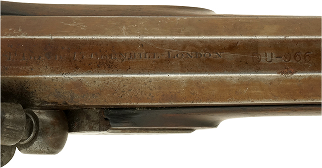 本品の銃身上面には、一部薄くなっていますが「P BOND 45 CORNHILL - LONDON」のメーカー刻印及びDU-966のシリアルNo.が打刻されています。 また、サイド・ロックにも「P BOND」の刻印が確認出来ます。