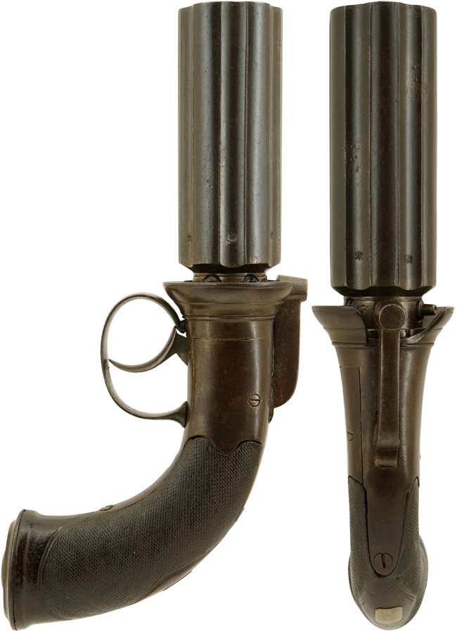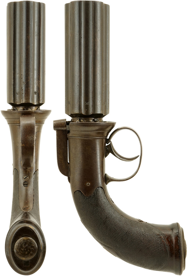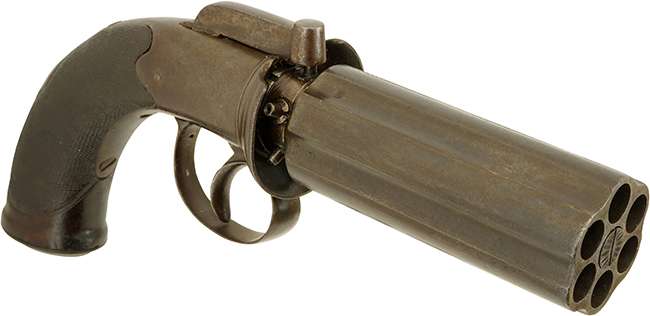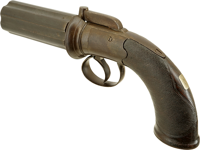 本品は1850~60年頃に英国で製造されたと考えられる、ペッパーボックスと呼ばれるダブル・アクションの管打ち式 (Percussion) 拳銃です。 本品のハンマー (撃鉄) はバー・ハンマーと呼ばれるもので、本体中央上部に位置した角棒型の支柱と円柱型の打撃部を組み合わせた独特な形状のハンマーがダブル・アクションによって雷管を叩く構造となっています。