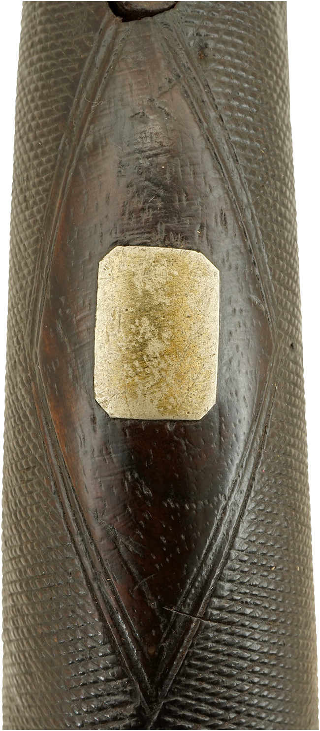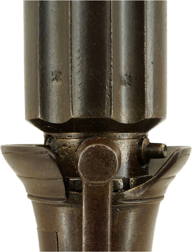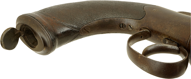 本品はグリップ下端がフラットな形状となっておりメーカー刻印等が一切見られない事から、ペッパーボックスとしては後期の1850~60年頃に製造されたグループIの品であると考えられます。 ハンマーはバー・ハンマー型で、フレーム前部にはパーカッション・ニップルに不意に衝撃が加わって暴発が発生しないようニップル・シールドと呼ばれるガードが円周に沿って設けられています。 また、その他の安全対策として、シリンダー後端にセーフティ・ノッチが設けられており、携行時にはこの部分にハンマー打撃面後部の突起を噛み合わせておく事で、パーカッション・ニップル同士の間にハンマーが固定されて暴発を防止する構造となっていました。 尚、引金はオーソドックスなトリガーとトリガー・ガードを組み合わせた形状となっています。 本品はグループIとしてはスタンダードな作りの品で、フレームやトリガー・ガードには彫刻等は施されていません。 グリップ下端には彫刻が施された円形の蓋を備えたコンパートメントが設けられています。 (KK)