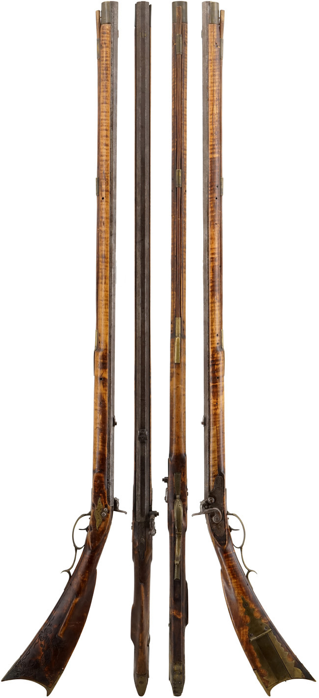 ペンシルベニア・ライフル (Pennsylvania Rifle) は、18世紀初頭にペンシルベニア南東で開発された狩猟用のライフルで、(アメリカン) ロング・ライフル (American Long Rifle) やケンタッキー・ライフル (Kentucky Rifle) といった名称でも呼ばれます。 これらは銃身内にライフリングが施された、ライフルド・マスケットとも呼ばれる初期のライフルの一種で、球形の鉛弾に回転を与える事により、高い弾道安定性を持っていました。 一方で、銃身内にライフリングの無いスムース・ボア (滑腔銃身) のマスケット銃に比べて弾丸と銃身内のクリアランスがタイトであったため、装填に時間が掛かるのが欠点でした。 (この装填に時間が掛かるという欠点は、その後登場したミニエー弾により解消される事となります)。