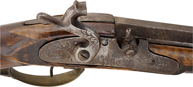 本品の銃身やサイド・ロックといった鉄部は、やや打ち傷や時代錆、若干の表面錆痕は見られるものの、大きな欠損等は見られず、概ねしっかりとした状態が保たれています。 木製銃床については、やや打ち傷や線傷が見られる他、銃床前半部右側面やバット・ストック後部左側面にひびが見受けられ、サイド・ロック周辺の木部には接木による補修痕が見受けられます。 真鍮製のノーズ・キャップやラム・ロッド・パイプ、トリガー・ガード、バット・プレートは適度な時代が付いた良い雰囲気となっています。