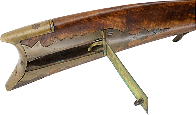 ペンシルベニア・ライフルの撃発機構は18世紀中頃に一般的となったフリント・ロック式がメインでしたが、19世紀前半に雷管を使用するパーカッション式 (管打ち式) の撃発機構が開発されると、フリント・ロック式のペンシルベニア・ライフルの多くがパーカッション式に改造されました。 また、一部には伝統的なペンシルベニア・ライフルのスタイルを保ったまま、当初からパーカッション式として製造された品も見られます。 本品もその内の一挺です。 19世紀にはケンタッキー・ライフルの派生型として全長の短いカービン・タイプであるホーケン・ライフル (プレーンズ・ライフル) と呼ばれる品も製造され、マウンテン・マン等のハンター達によって愛用されました。