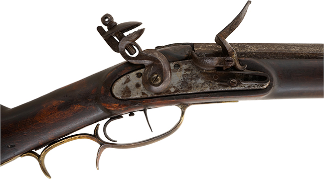 本品のトリガー・ガードはスパー (指掛) を備えており、バット・プレート部の角が尖った形状となっている点などは、オーソドックスなペンシルベニア・ライフルの形状を踏襲していますが、バット・ストックの下方へのカーブは一般的なペンシルベニア・ライフルに比べて緩やかなものとなっています。 フロント・サイトは洋白製と思われるアリ溝固定のブレード・サイトで、リア・サイトはアリ溝固定のセミ・バックホーン・サイトとなっています。 トリガーは精密な射撃を可能にするダブル・セット・トリガーとなっており、当時多数出回っていた安価なトレード・ガンとは一線を画しています。 全体としては装飾性は控えめの、実用的な作りの銃です。