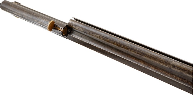 本品の銃身やアンダー・レバーといった鉄部には、やや経年による褪色の他、若干の時代錆及び表面錆痕が表れているものの、目立った欠損等も見られず、製造された時代及び幕末から国内に存在していた事を考慮すれば、比較的良好な状態が保たれています。 砲金製の機関部についても、適度な時代が付いた良い雰囲気となっており、こちらもやや打ち傷は見られるものの、目立った欠損や腐食等は見受けられません。 木製のバット・ストックについても、やや打ち傷や線傷の他、ストック基部両側面に一部ヘアライン・クラックが見られるものの、強度的にはしっかりとした状態が保たれており、艶のある仕上げも比較的残っています。 バット・プレートについても同様に適度な時代が付いており、若干の小傷や角の部分の僅かな擦れを除いて、現状大きな腐食や変形等は見られず、ストック内コンパートメントの蓋の開閉についても問題なく行う事が可能です。