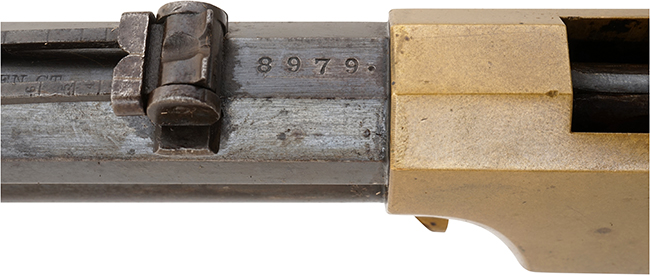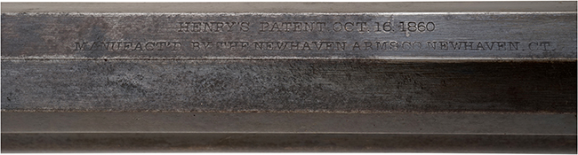 本品はヘンリー・ライフルとしては後期の生産品のため、バット・プレートの角は尖った形状となっており、レシーバーは上面にリア・サイト取り付け用のアリ溝が設けられていない仕様となっています。 本品のリア・サイト後方の銃身上面にはシリアルNo.8979が打刻されており、このシリアルNo.から本品が1865年に製造された品である事が窺えます。 また、リア・サイト前方の銃身上面には「HENRY'S PATENT OCT. 16. 1860」のパテント刻印と「MANUFACT'D BY THE NEW HAVEN ARMS CO. NEWHAVEN, CT.」のアドレス刻印が二行にわたってはっきりと入っています。