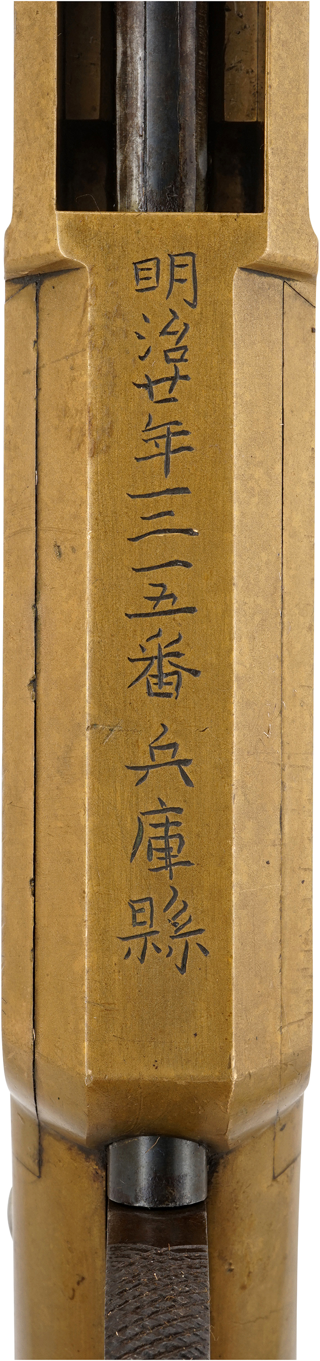 本品の機関部上面には、「明治廿年一二一五番 兵庫縣」の刻印が確認出来ます。 通称「壬申刻印 (明治5年)」と呼ばれる古式銃の一種の戸籍番号に相当しますが、本品は「明治20年」なので、厳密には明治5年の「壬申刻印」ではありません。 しかしながら、刻印が打刻された目的/意味/用途は同じです。