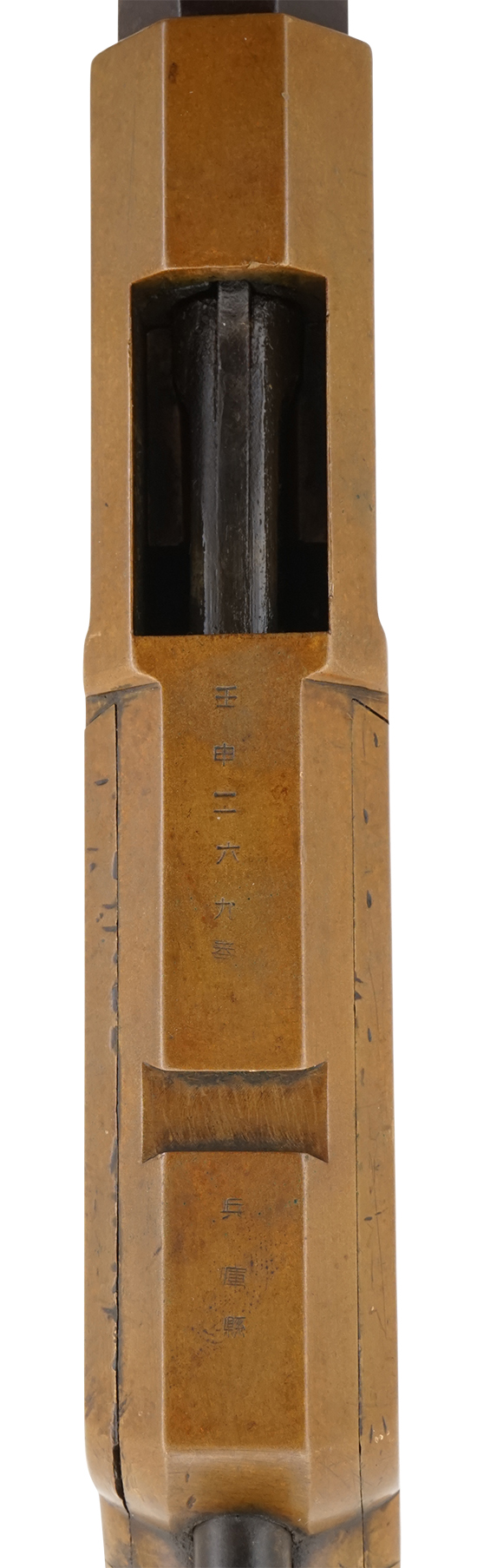 本品の機関部上面には「壬申二六九番 兵庫縣」の壬申刻印が入っています。 明治4年に明治陸軍は主力小銃の統一化を図る為、旧藩に残る銃砲の種類、挺数の把握が急務となりました。 翌明治5年 (1872年、壬申) 1月から、太政官布告第28号第五則の「銃砲取締規則」によって、私蔵されていた銃砲の「我が国初の管理統制」が始まりました。 廃藩時に旧藩は旧家臣に軍用銃を下付した事例が多く見られ、旧士族の家には一挺の軍用銃があったとも言われています。 それらの銃はその後市中に大量に出回り私蔵されていました。 銃砲取締規則ではこれらの私蔵されていた銃砲について、管轄庁 (東京と大阪は武庫司) に持参して改刻印式によって番号、官印を受ける (これが明治5年度であれば壬申刻印と番号) 事が義務付けられました。 同時に管轄庁は同人名と番号を管轄鎮台に届け出て、鎮台より武庫司にそれらが提出される仕組みになっていました。 この調査は明治20年代頃まで銃砲調査が行われましたが、明治5年 (1872年=壬申) の調査が最も大々的に行われ、今日この種類の刻印の内90-95%が壬申の年に行われた事から、古式銃に打たれた漢字の刻印をまとめて「壬申刻印」と呼ばれる事もあります。 本品には「壬申二六九番 兵庫縣」の刻印が入っている事から明治5年 (1872年) に兵庫県で銃砲調査を受けた事が判ります。