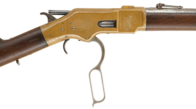 ウィンチェスター社はオリバー・ウィンチェスターにより創業された元繊維会社で、1857年に独自のレバー・アクション構造のパテントを持っていたボルカニック リピーティング・アームズ社の武器製造工場を買収したのが銃器産業に参入する切っ掛けとなりました。 当初はニューヘイヴン・アームズ社として創業し、ヘンリー ライフルとして知られるボルカニックの進化型であるレバー・アクション ライフルの製造権を取得すると、オリバーの息子であるウィリアムにより全米で販売を開始しました。 そして1866年にウィンチェスター社として改名後は、工場長であったネルソン・キングのパテントによりヘンリー ライフルの欠点であったマガジンを改良し、フレーム右側面のローディング・ゲートから弾薬を装填出来るようにしました。 更にハンド・ガードを追加する事により、連続射撃による銃身の過熱から手を守る工夫などの改良を施した「M1866」を発売しました。 この銃はフレーム全体が真鍮製 (砲金製="bronze alloy" または "gun metal") であることから「イエローボーイ」と一般的に呼ばれています。 一世紀半の時を経て金色に輝いていたフレームがまさに「イエロー」と呼ばれる色合いになった貴重な品も弊社には入荷しています。