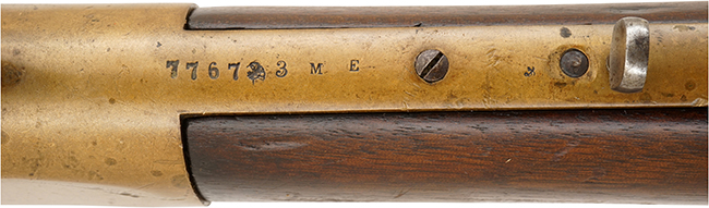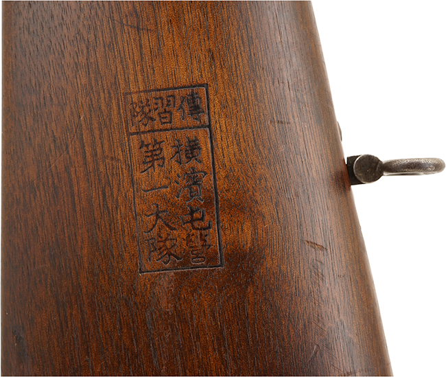 本品の銃身やアンダー・レバーといった鉄部については、全体に仕上げが落ちて白磨きのような状態となっており、やや打ち傷や若干の時代錆及び表面錆痕が見受けられるものの、現状目立った欠損等は見られず、概ねしっかりとした状態が保たれています。 イエローボーイの特徴でもある砲金製の機関部についても、やや打ち傷は見受けられるものの、大きな欠損等は見受けられず、適度な時代のついた良い雰囲気となっています。 傷み易いバット・プレートについても、やや打ち傷は見られるものの、目立った腐食や変形等は見られず、銃床への取り付けもがたつきもなくしっかりとしています。 ストック内コンパートメントのスライド式の蓋の開閉についても問題なく行う事が可能です。 ハンドガードやバット・ストックといった木部についてはオリジナルのウォールナット製で、色合いもほぼマッチしています。 バット・ストック右側面には「傳習隊 横濱屯営第一大隊」の刻印が入っています。 木部はやや打ち傷や線傷が見られる他、ハンドガード先端やバット・ストック基部に一部ヘアライン・クラックが見られるものの、それ以外には大きな破損等は見受けられず、各部の取り付けについてもがたつきもなくしっかりとしています。 バット・ストック取付基部やバット・プレート取り付け部周辺の木部に僅かに痩せが見られますが、あまり気にならないレベルのものです。 前後スリング・スイベルには現状固着等は見られません。 リア・サイトの調整については問題なく行う事が可能です。