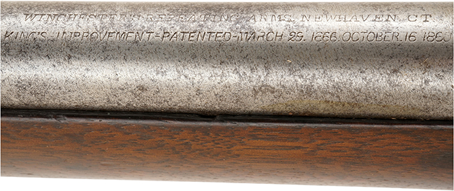本品はウィンチェスター社製オリジナルのM1866 イエローボーイ マスケットの3rd Modelです。 ウィンチェスター M1866は、1stモデルから4thモデルへと改良されるに従って、ヘンリー ライフルから受け継いだ特徴が徐々にイエローボーイ独自の形状に変化しました。 ハンマー前方のフレーム後部のカーブは、ヘンリー ライフルでは一旦急なカーブを描いて落ち込み、顕著なくびれを経て銃把部分へと繋がるHenry Dropと呼ばれるデザインでしたが、イエローボーイでは改良されるに従ってHenry Dropの面影が薄くなり、次第になだらかな形状となります。 3rd ModelではHenry Dropが2nd Modelに比べてなだらかな形状となり、シリアルNo.が銃の外部に初めて打刻されるようになったモデルで、基本的にはシリアルNo.はブロック体に近いフォントでトリガー後方に打刻されています。 本品のフロント・サイトは鉄製のブレード・サイトで、リア・サイトは900ヤードまで対応した折り畳み式のラダー・サイトとなっています。 3rd Modelではヘンリーのパテント刻印が省略されるようになった代わりに、「King’s Improvement」の刻印が打刻されるようになりました。 本品の銃身上面にも「WINCHESTER-REPEATING-ARMS NEW HAVEN CT.」のメーカー・アドレス刻印及び「KING'S-IMPROVEMENT-PATENTED-MARCH 29. 1866. OCTOBER 16. 1860.」のパテント刻印が二行にわたって入っています。