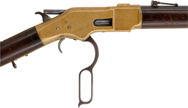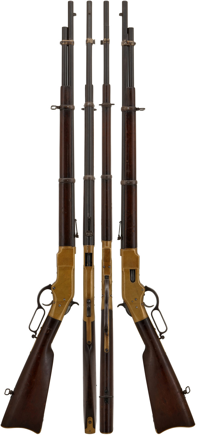 ウィンチェスター社はオリバー・ウィンチェスターにより創業された元繊維会社で、1857年に独自のレバー・アクション構造のパテントを持っていたボルカニック リピーティング・アームズ社の武器製造工場を買収したのが銃器産業に参入する切っ掛けとなりました。 当初はニューヘイヴン・アームズ社として創業し、ヘンリー ライフルとして知られるボルカニックの進化型であるレバー・アクション ライフルの製造権を取得すると、オリバーの息子であるウィリアムにより全米で販売を開始しました。 そして1866年にウィンチェスター社として改名後は、工場長であったネルソン・キングのパテントによりヘンリー ライフルの欠点であったマガジンを改良し、フレーム右側面のローディング・ゲートから弾薬を装填出来るようにしました。 更にハンド・ガードを追加する事により、連続射撃による銃身の過熱から手を守る工夫などの改良を施した「M1866」を発売しました。 この銃はフレーム全体が真鍮製 (砲金製="bronze alloy" または "gun metal") であることから「イエローボーイ」と一般的に呼ばれています。 一世紀半の時を経て金色に輝いていたフレームがまさに「イエロー」と呼ばれる色合いになった貴重な品も弊社には入荷しています。