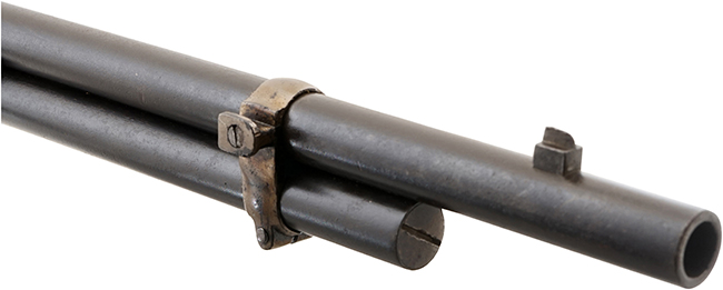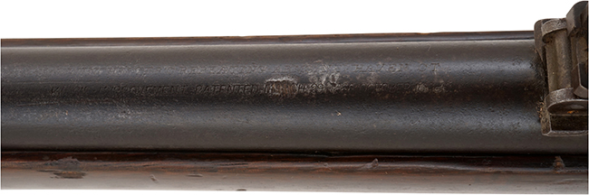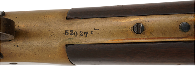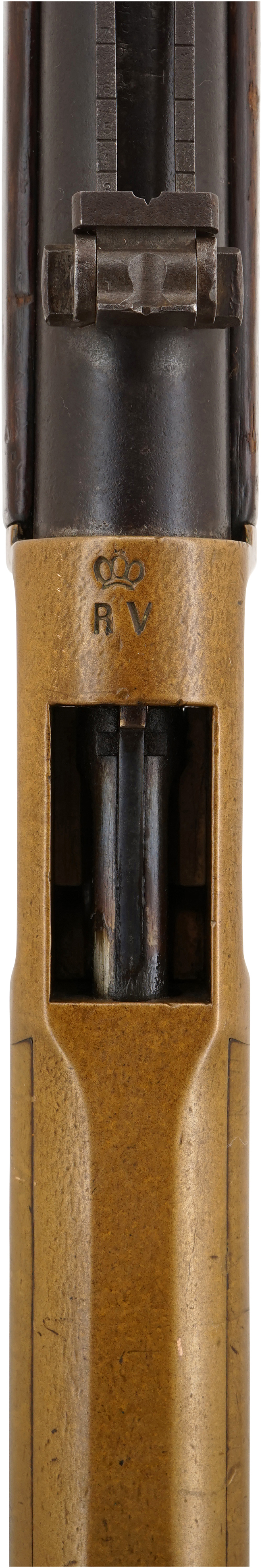 本品はウィンチェスター社製オリジナルのM1866 イエローボーイ マスケットの3rd Modelです。 ウィンチェスター M1866は、1stモデルから4thモデルへと改良されるに従って、ヘンリー ライフルから受け継いだ特徴が徐々にイエローボーイ独自の形状に変化しました。 ハンマー前方のフレーム後部のカーブは、ヘンリー ライフルでは一旦急なカーブを描いて落ち込み、顕著なくびれを経て銃把部分へと繋がるHenry Dropと呼ばれるデザインでしたが、イエローボーイでは改良されるに従ってHenry Dropの面影が薄くなり、次第になだらかな形状となります。 3rd ModelではHenry Dropが2nd Modelに比べてなだらかな形状となり、シリアルNo.が銃の外部に初めて打刻されるようになったモデルで、基本的にはシリアルNo.はブロック体に近いフォントでトリガー後方に打刻されています。 本品のフロント・サイトは鉄製のブレード・サイトで、リア・サイトは900ヤードまで対応した折り畳み式のラダー・サイトとなっています。 3rd Modelではヘンリーのパテント刻印が省略されるようになった代わりに、「King's Improvement」の刻印が打刻されるようになりました。 本品の銃身上面にも一部薄くなっている箇所は見られるものの、「WINCHESTER-REPEATING-ARMS NEW HAVEN CT.」のメーカー・アドレス刻印及び「KING'S-IMPROVEMENT-PATENTED-MARCH 29. 1866. OCTOBER 16. 1860.」のパテント刻印が二行にわたって入っているのが確認出来ます。 本品の排莢孔前方の機関部上面には王冠と「RV」の文字を組み合わせた刻印が打刻されており、この刻印の入った個体はスペイン向けに輸出された品と言われています。 銃身前部には着剣装置がネジ止めにより固定されています。