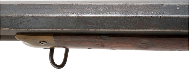 M1866には銃身長が27インチのマスケット、24インチのライフル、20インチのカービンがありました。 本品は銃身長24インチのライフル・モデルです。 バット・プレートについては、マスケットはカービン型と呼ばれるなだらかなカーブを描いた形状、ライフルはクレセント型 (三日月型) と呼ばれる、強いカーブを描き、角が尖った形状で、カービンにはカービン型とクレセント型の両方が見られます。