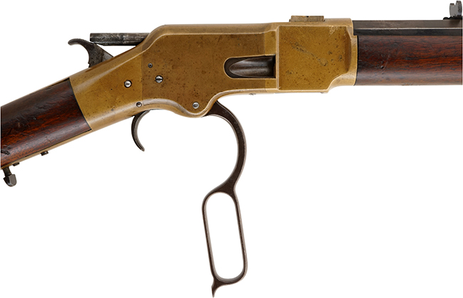 本品は米国ウィンチェスター社製オリジナルのM1866 イエローボーイ ライフル 2ndモデルです。 ウィンチェスター M1866 イエローボーイ カービンは、1stモデルから4thモデルへと改良されるに従って、ヘンリー ライフルから受け継いだ特徴が徐々にイエローボーイ独自の形状に変化しました。 ハンマー前方のフレーム後部のカーブは、ヘンリー ライフルでは一旦急なカーブを描いて落ち込み、顕著なくびれを経て銃把部分へと繋がるHenry Dropと呼ばれるデザインでしたが、イエローボーイでは改良されるに従ってHenry Dropの面影が薄くなり、次第になだらかな形状となります。 本品は2ndモデルで、フレーム後部の形状は1stモデルに比べてなだらかになっていますが、Henry Dropと呼ばれるヘンリーの面影は比較的残っています。 本品のフロント・サイトは頂部が真鍮製となった鉄製のブレード・タイプで、アリ溝により固定されています。 リア・サイトはステップ・エレベーターにより調整可能なセミ・バックホーン・サイトが取り付けられています。 本品の銃身上面には「WINCHESTER'S REPEATING ARMS. NEW HAVEN. CONN U.S.A」のメーカー・アドレス刻印及び「-KING'S IMPROVEMENT PATENTED MARCH 29. 1866. OCTOBER 16. 1860.-」のパテント刻印が二行にわたって入っています。 シリアルNo.はロア・タングに打刻されていますが、バット・ストックを取り外した状態でのみ確認出来るようになっています。 このような打刻方法は、シリアルNo.が概ね21,000までの個体に見られます。 尚、ハーフ・コック機能はシリアルNo.が23,000以降から導入されたため、本品もハーフ・コック機能を元々備えていません。