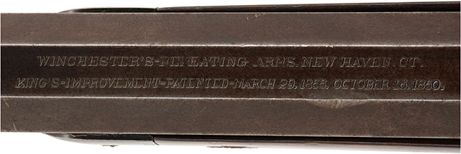 (種別: 管打ち式銃砲、全長: 108.9cm、銃身長: 60.0cm、口径: 1.1cm、銘文: WINCHESTER'S-REPEATING-ARMS NEW HAVEN.C.T. KING'S-IMPROVEMENT-PATENTED-MARCH29 1866 OCTOBER16 1860)
