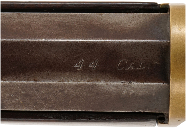 本品は米国ウィンチェスター社製オリジナルのM1866 イエローボーイ ライフル 4thモデルです。 ウィンチェスター M1866 イエローボーイ カービンは、1stモデルから4thモデルへと改良されるに従って、ヘンリー ライフルから受け継いだ特徴が徐々にイエローボーイ独自の形状に変化しました。 ハンマー前方のフレーム後部のカーブは、ヘンリー ライフルでは一旦急なカーブを描いて落ち込み、顕著なくびれを経て銃把部分へと繋がるHenry Dropと呼ばれるデザインでしたが、イエローボーイでは改良されるに従ってHenry Dropの面影が薄くなり、次第になだらかな形状となります。 本品は最後期の4thモデルのため、フレーム後部の形状はヘンリーの面影 (Henry Drop) が殆ど見られない、なだらかなカーブを描いた形状となっています。 本品のフロント・サイトは洋白製のブレード・タイプで、アリ溝固定式のフロント・サイト基部は鉄製となっています。 リア・サイトはステップ・エレベーターにより調整可能なセミ・バックホーン・サイトが取り付けられています。 本品の銃身上面には「WINCHESTER-REPEATING ARMS. NEW HAVEN. CT.」のメーカー・アドレス刻印及び「KING'S-IMPROVEMENT-PATENTED-MARCH 29. 1866. OCTOBER 16. 1860.」のパテント刻印が二行にわたって入っています。 リア・サイト後方の銃身上面には「44 CAL.」の使用弾薬表示が打刻されています。 また、本体下部のエレベーター下面にも「44 CAL.」の刻印が確認出来ます。 シリアルNo.はロア・タング後部に手書き風のスクリプト書体により打刻されています。