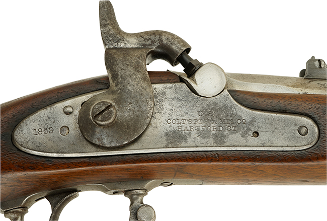 M1861 マスケットは南北戦争中に北軍で最も多く使用された小銃となり、スプリングフィールド造兵廠だけでは生産が追い付かず、コルト社など約20の民間メーカーで製造されました。 合衆国政府から M1861 マスケットの発注を受けたコルト社は、スプリングフィールド M1861 マスケットに対していくつかの小改良を加え、1862年9月から製造を開始しました。 コルト社が製造したM1861 マスケットは、ハンマーの形状がS字型に変更されたほか、パーカッション・チャンバー (ボルスター) の清掃用ネジが廃止され、バンドの固定方法も板バネからネジ留めに変更されています。 これらのコルト社による小改良は、後にM1861 マスケットの後継であるスプリングフィールド M1863 マスケットにも取り入れられることとなりました。