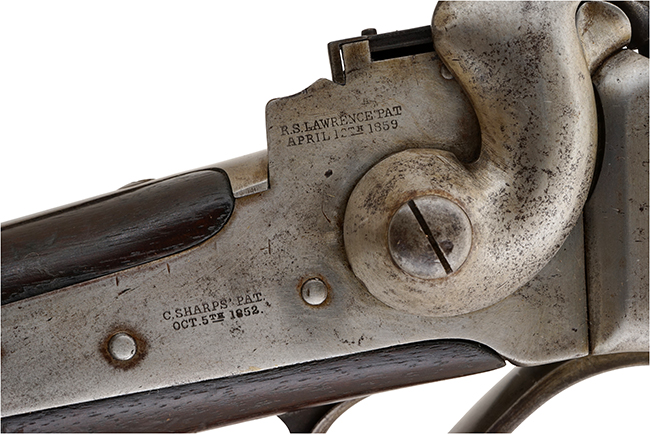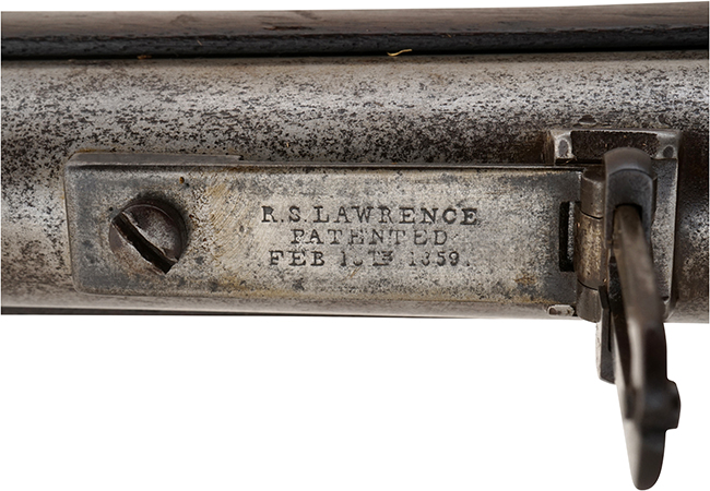 本品の機関部右側面には、ローレンス・ペレット・システムのパテントを示す「R.S.LAWRENCE PAT APRIL 12TH 1859」及び「C.SHARPS' PAT OCT.5TH 1852」のシャープスのパテント刻印が確認できます。 尚、機関部左側面の「C.SHARPS' PAT SEPT. 12TH 1848」のシャープスのパテント刻印や銃身上面の「SHARPS RIFLE MANUFG. CO HARTFORD CONN」のメーカー刻印は一部薄くなり判読が難しくなっています。 他にも、銃身上面後部には「NEW MODEL 1859」のモデル名刻印が入っており、リア・サイト・ベースには「R.S.LAWRENCE PATENTED FEB 15TH 1859.」のパテント刻印が確認出来ます。