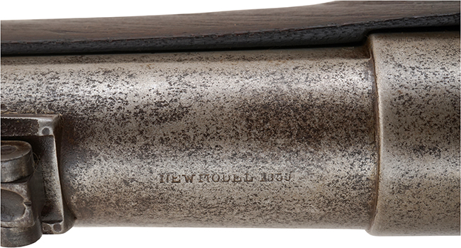 本品のアッパー・タング上面にはシリアルNo.52662が入っている他、ハンドガードを外した銃身下面にも同じシリアルNo.が入っています。 このシリアルNo.は、M1859 カービンのシリアルNo.の範囲の間に収まっている事から、銃身、機関部共にオリジナルのM1859 カービンの物である事が分かります。