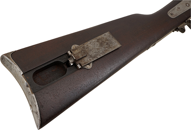 本品の銃身や機関部といった鉄部は、やや打ち傷や時代錆及び表面錆痕は見られるものの、目立った欠損等は見られず、製造された時代を考慮すれば比較的良好な状態が保たれています。 木製のハンドガードやバット・ストックについても、やや打ち傷や線傷が見られる他、ハンドガード前部の縁に若干の欠け、ハンドガード後部下面に一部ひびが見られますが、各部の取り付けはがたつきもなくしっかりとしています。 傷み易いバット・プレートについても、若干の時代錆や表面錆が見られる程度で、目立った変形等は見られず、銃床への取り付けもがたつき等は見られません。 銃床側面のパッチ・ボックスの蓋の開閉については問題なく行う事が可能で、しっかりとしたテンションが掛かっています。