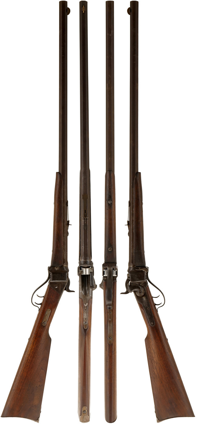 本品は漫画家の松本零士先生のコレクションの中の一挺です。 シャープス スポーティング・ライフルは、シャープス小銃のバリエーションの中でも最も貴重なモデルの一つです。 おそらく国内で唯一と思われる試作品のヘビー・バレルにセット・トリガーを備えたリム・ファイアの精密射撃用で、バッファロー・ライフルの先駆けとなりました。 (KK)(MM)