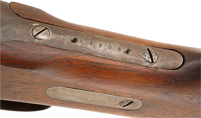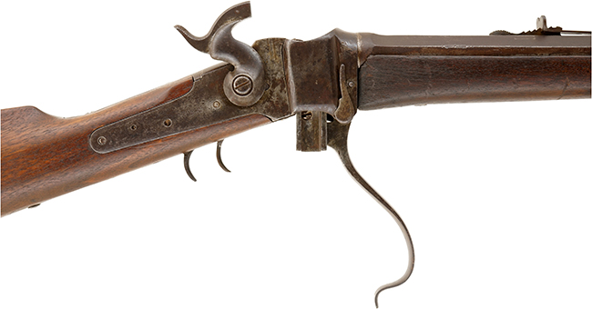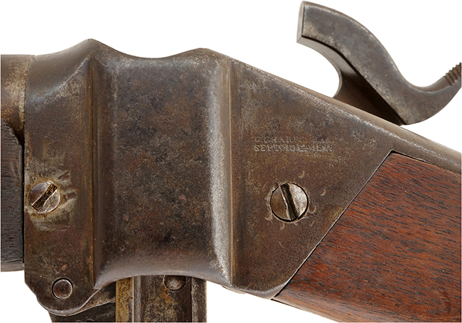 本品は極めて珍しいシャープス スポーティング・ライフルです。 フレーム左側面には「C. SHARPS PAT. SEPT. 12TH 1848」のパテント刻印が打刻されています。 また、ロック・プレートには「C.SHARPS PAT. OCT 5TH 1852」のパテント刻印も確認出来ます。 トリガーは精密な射撃が可能なダブル・セット・トリガーとなっています。 銃身上面にはリア・サイトで一部隠れていますが、「SHARPS RIFLE CO. BRIDGEP□」のアドレス刻印が確認出来る事から、コネチカット州のブリッジポートのシャープス ライフル社でリム・ファイア弾仕様に改修された品と思われます。 ロック・プレートは管打式モデルと同様の厚みのある形状となっていますが、ローレンス・ペレット・プライマー・システムは当初から備えていません。