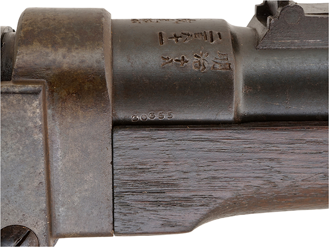 本品は全体に適度な時代が付いた良い雰囲気となっており、銃身や機関部といった鉄部は、やや打ち傷や経年による褪色の他、若干の時代錆や表面錆は見られるものの、目立った欠損等は見られず、銃身のブルー仕上げや機関部のケース・ハードン仕上げも比較的良好に残っています。 木製のハンドガードやバット・ストックについては、若干の打ち傷や線傷の他、一部僅かな欠けが見られるものの、大きな破損等は見られず、比較的良好な状態が保たれています。 バット・ストック左側面には墨書きにより草書体の漢字と思われる文字が書かれていますが、非常に薄くなっており、現状判読は難しくなっています。 傷み易いバット・プレートについても、若干の時代錆や表面錆痕は見られるものの、目立った変形等は見られず、バット・ストックへの取り付けもがたつきもなくしっかりとしています。 リア・サイトの切り替えについては問題なく行う事が可能です。