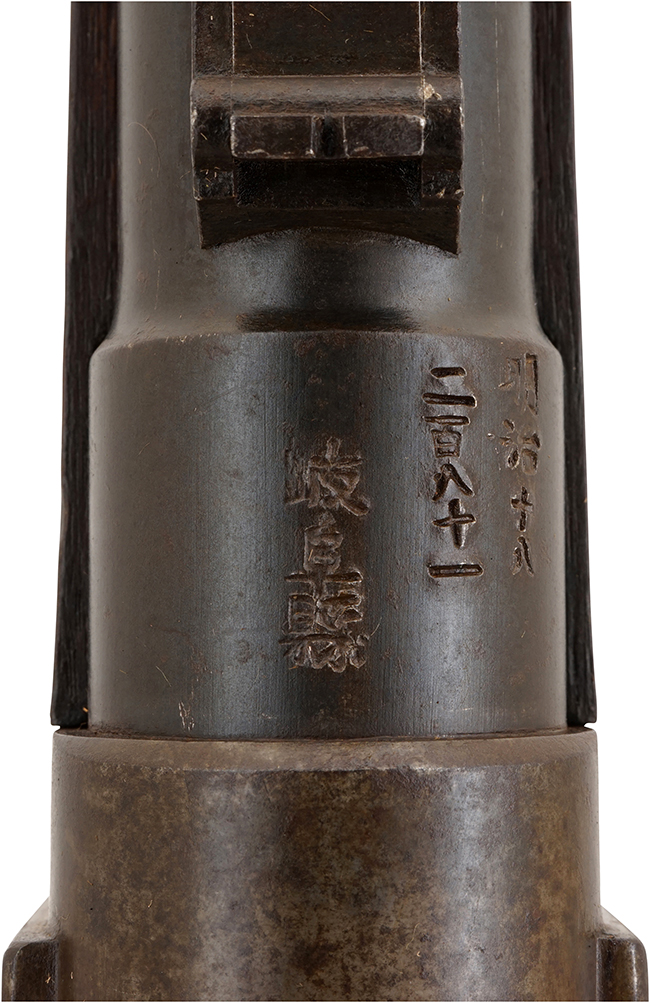 明治4年に明治陸軍は主力小銃の統一化を図る為、旧藩に残る銃砲の種類、挺数の把握が急務となりました。 翌明治5年 (1872年、壬申) 1月から、太政官布告第28号第五則の「銃砲取締規則」によって、私蔵されていた銃砲の「我が国初の管理統制」が始まりました。 廃藩時に旧藩は旧家臣に軍用銃を下付した事例が多く見られ、旧士族の家には一挺の軍用銃があったとも言われています。 それらの銃はその後市中に大量に出回り私蔵されていました。 銃砲取締規則ではこれらの私蔵されていた銃砲について、管轄庁 (東京と大阪は武庫司) に持参して改刻印式によって番号、官印を受ける (これが明治5年度であれば壬申刻印と番号) 事が義務付けられました。 同時に管轄庁は同人名と番号を管轄鎮台に届け出て、鎮台より武庫司にそれらが提出される仕組みになっていました。 この調査は明治20年代頃まで銃砲調査が行われましたが、明治5年 (1872年=壬申) の調査が最も大々的に行われ、今日この種類の刻印の内90-95%が壬申の年に行われた事から、古式銃に打たれた漢字の刻印をまとめて「壬申刻印」と呼ばれています。 本品には「明治十八 二百八十一 岐阜縣」の刻印が打刻されている事から、本品が明治18年に岐阜縣 (岐阜県) で同様の検査を受けた事を示していると思われます。