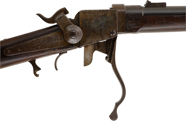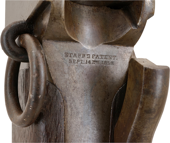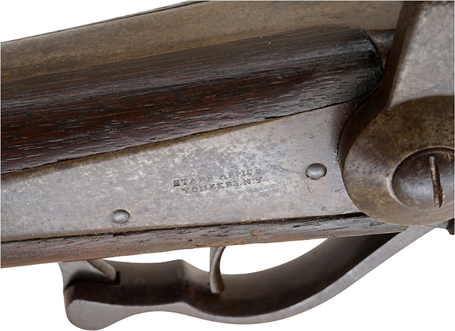 本品の本体右側面のロック・プレートには一部薄くなっているものの「STARR ARMS CO YONKERS, N.Y.」のメーカー刻印が二行で入っており、銃身上面にも一部判読が難しいものの「STARR ARMS Co YONKERS, N.Y.」の刻印が確認出来ます。 また、機関部後部上方には「STARR’S PATENT. SEPT. 14TH 1858」のパテント刻印が二行で入っています。 銃身基部右側面にはシリアルNo.30355が打刻されています。
