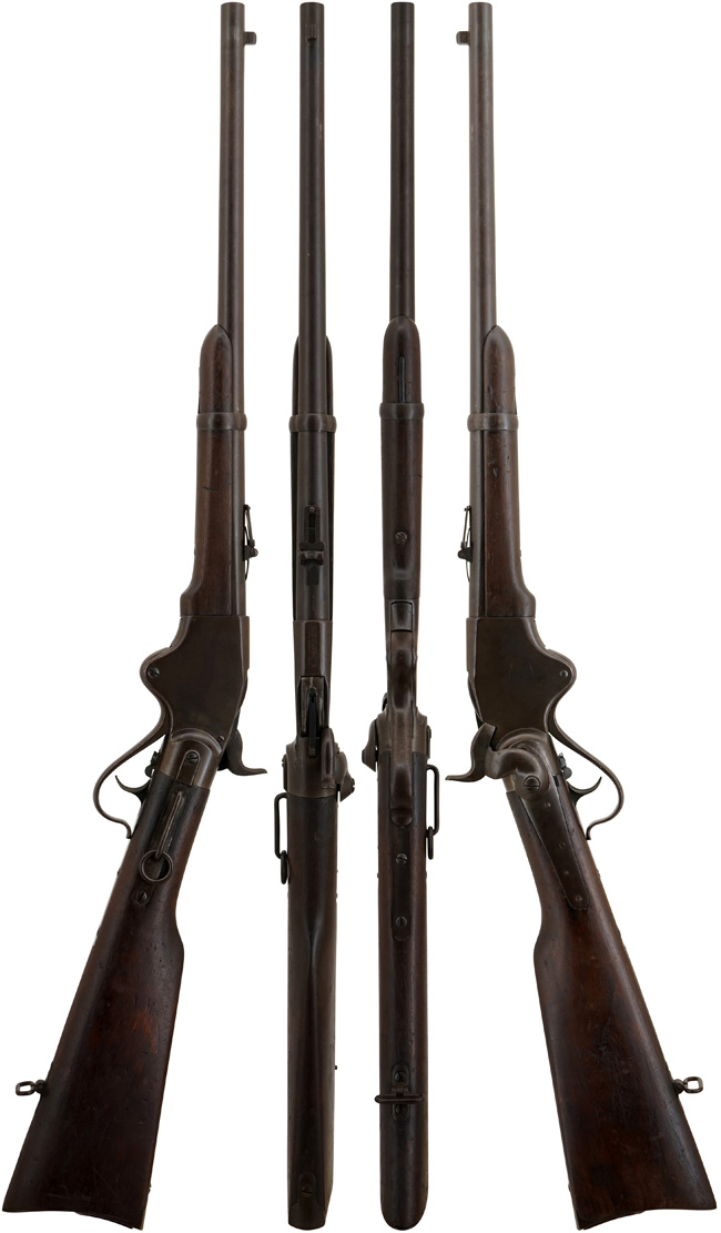 スペンサー小銃の最初のモデルはM1860で、南北戦争 (1861年-1865年) において主に北軍によって使用されました。 スペンサーM1860ライフルはカービンに先駆けて1862年のシャープスバーグ (Sharpsburg) の戦いで始めて支給されました。 有名な1863 年のゲティスバーグ (Gettysburg) の戦いでは、カスター将軍 (当時北軍騎兵旅団司令官) の配下のミシガン第5騎兵連隊の2個部隊もカービン (騎兵銃) ではなくライフル (歩兵銃) を使用し南軍を撃退しました。 尚、スペンサーM1860カービンの銃身長は22インチで、ライフルは30インチでした。