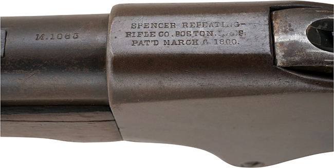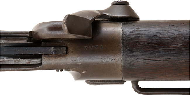 本品の銃身基部上面には「M.1865」のモデル名が打刻されており、レシーバー上面には「SPENCER REPEATING RIFLE CO. BOSTON. MASS. PAT'D MARCH 6 1860.」のメーカー刻印及びパテント刻印が確認出来ます。 また、レシーバー後部上面にはシリアルNo.7771が確認出来ます。