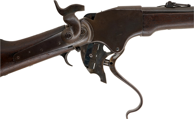 スペンサー連発銃 (Spencer Repeating Rifle) は、クリストファー・スペンサー (Christopher Miner Spencer、1833年6月20日-1922年1月14日) が開発した後装内火式の7連発レバー・アクション小銃で、1860年から1869年の間に生産されました。 クリストファー・スペンサーは元々はコルト社の社員でしたが、そこで銃器の設計技術を学び、26歳の若さでスペンサー連発機構のパテントを取得しています。 スペンサー小銃はトリガー・ガードを兼ねたレバーを下方に引く事によってブリーチ・ブロックが下降し、バット・ストック内の管状弾倉 (Tube Magazine) から弾丸を薬室に送り込むと同時に空薬莢を上部から排莢します。 当時スペンサー小銃に対抗できる連発銃はヘンリー ライフルのみでしたが、ヘンリー弾は.44RFという拳銃弾程度の威力しかなく、軍用としてのストッピング・パワーではスペンサーがヘンリーに勝っていました。 しかしながら13連発という装弾数と同じレバー・アクション (操作) ながら、ハンマーも同時に起す事のできるヘンリー ライフルの方に軍配があがりました。 スペンサー小銃はレバー操作とは別に、ハンマーを親指で起こす必要がありました。