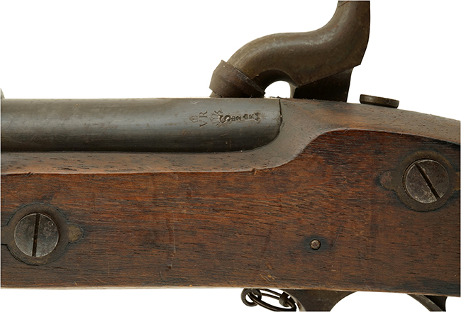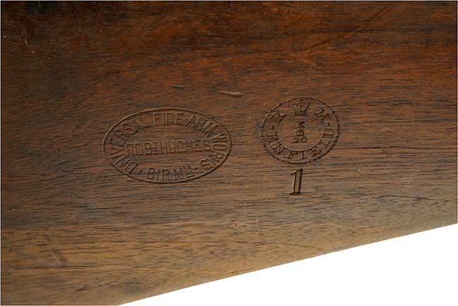 本品のサイド・ロック・プレートには、「ENFIELD 1863」の刻印の他、王冠の下にVictoria Reginaを示す「V.R.」のアルファベット入った刻印が見られる事から、本品のロック・プレートが英軍向けとして1863年に製造された事が判ります。 リア・サイト後方の銃身上面には「WHITWORTH-PATENT」の刻印が確認出来る他、銃身後端の左側面には王冠と「VR」を組み合わせた刻印を含む複数の検査刻印が確認出来ます。 本品はライフリング以外はエンフィールドP1853 3バンド小銃と同じように見えますが、作りが遥かに上等です。 バット・ストック右側面には二つの刻印がはっきりと綺麗に入っています。 一つは製造者の刻印で「UNVERSAL FIRE ARM WORKS, BIRMM, ROBt HUGHES」の刻印となっています。 これは英国第二の都市であり銃産業の中心地であったバーミンガム (Birmingham) のモランド・ストリート100番地でライフルや拳銃を製造していた著名なガン・メーカー、ロバート・ヒュー (Robert Hughes,1855年-1900年) の製品である事を示しています。 彼は1868年にバーミンガムでユニバーサル ファイア・アームズ ワークス (Universal Firearms Works) の名称を採用しました。 彼は余剰となった軍用銃器や部品を購入して、それらを改造したり、新たに組み立てて民間市場や輸出市場向けに供給していました。 彼の製品は、当時ロンドンの銃器愛好家の中でも貴族などアフリカやアジアでの狩猟旅行を行う人々の間で高い評価を得ていました。 本品は英軍から放出された部品をロバート・ヒューが組み上げて製造されたホイットワース小銃である事が窺えます。 ホイットワースの優れた特殊ライフリングにロバート・ヒューの製造技術が加わった、実用的にも非常にクオリティの高い品です。 バット・ストックに入っているもう一つの刻印は、英国エンフィールド造兵廠の検査刻印で、円の中に「ENFIELD」の文字の他、王冠と「R M」の文字を組み合わせた刻印、そして王冠の上下に「E」の文字と「20」の数字を組み合わせたマークが打刻されています。