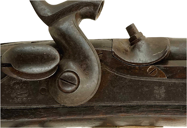 本品の銃身上面には「T. WILSON'S PATENT」のパテント刻印が打刻されており、遊底上部のカバーの上面にもこれを略した「T.W P」の文字が逆三角形の中に入ったパテント刻印が入っています。 銃身基部上面には小さな王冠とトーマス・ウィルソンの頭文字である「T W」の文字を組み合わせた刻印の他、シリアルNo.A4768が打刻されています。 このシリアルNo.は遊底及び遊底上部のカバーとまっちしています。 ロック・プレートには王冠刻印及び製造年を示す「1867」の刻印の他、ヤシの木と「R B」の文字を組み合わせた刻印が確認出来ます。 このヤシの木の刻印については現時点では詳細は不明ですが、弊社で取り扱った別個体のウィルソン小銃でも同様の刻印が確認されています。 銃身左側面後方には英国のバーミンガム (Birmingam) のプルーフ刻印が打刻されています。 銃口側から最終検査刻印 (Definitive Proof Mark)、ゲージ刻印 (25は.577口径を表します)、製造所検査刻印 (View Mark)、ゲージ・テスト刻印 (25は.577口径を表します)、暫定検査刻印 (Provisonal Proof Mark: 1855-1904年の間にバーミンガム・プルーフ・ハウスで実施された、ライフリングを切る前の銃身の検査刻印) で、典型的なバーミンガム銃器製造協会会員のメーカー製である事を示す刻印です。