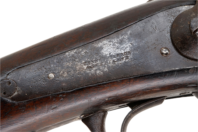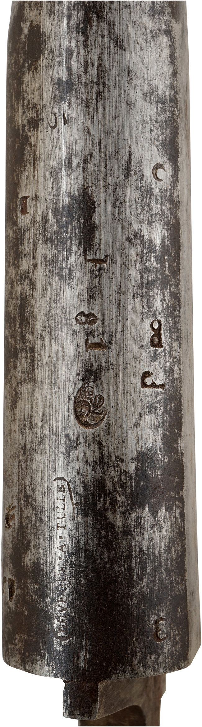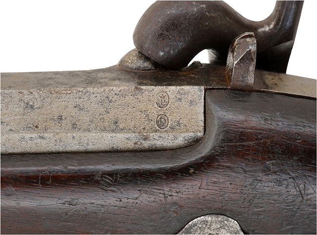 本品はフランス サン=テティエンヌ (Saint-Etienne) のVerney Carron社が製造したMle 1842T 歩兵銃で、銃身内には4条のライフリングを備えています。 本品のロック・プレートには、表面錆痕によりやや判読が難しくなっていますが、「VERNEY CARRON A ST ETIENNE」と読めるメーカー刻印が確認出来ます。 また、銃身基部左側面には楕円形の中に「王冠とP」及び「D」と思われる文字が入ったプルーフ刻印が確認出来ます。 また、バット・ストック右側面には王冠とRを組み合わせたプルーフ刻印も確認出来ます。