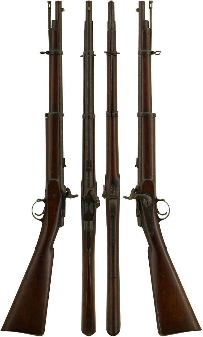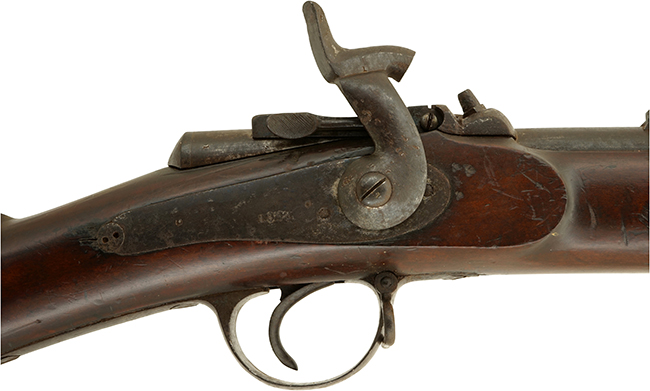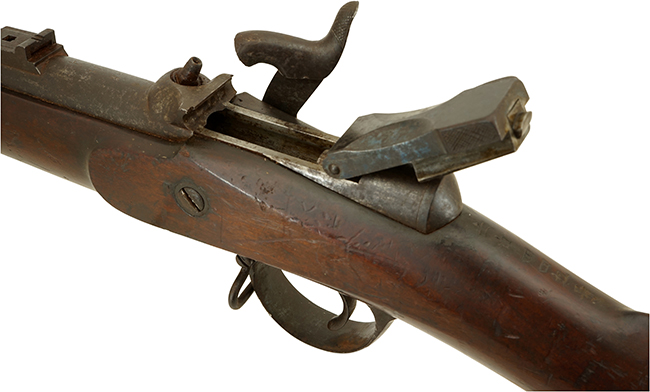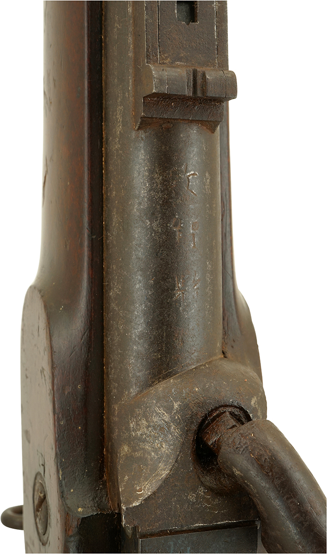 本品はロック・プレートに「1868」の刻印が打刻されている事から、1868年に製造された事が窺えますが、製造者を示す刻印は一切確認出来ません。 しかしながら、銃床のフロント・エンド・キャップやバレル・バンドの形状に英国製騎兵銃の特徴が見られる事から、英国で製造されたと考えられます。 口径は他の現存個体が.577口径であるのに対し、本品は実測約12,3mm (.48口径) とやや小口径となっており、銃身内には6条のライフリングが施されています。 また、現存する他の個体では、サイド・ロックがエンフィールド小銃など従来の前装管打式小銃からの流用と思われる形状となっていますが、本銃のサイド・ロックはいずれの個体とも異なるもので、ハンマーがロック・プレートの最前部に取り付けられているバック・アクションと呼ばれる形状が特徴です。 このバック・アクションの軍用銃はフランスやベルギーなどヨーロッパ大陸ではポピュラーですが英国ではブラウンズウィック・ライフル(Brunswick Rifle)など少数にとどまります。本品は典型的なエンフィールド型の銃床にフランス風のバック・アクションが如何にも試作品感を出しています。(KK)(MM)