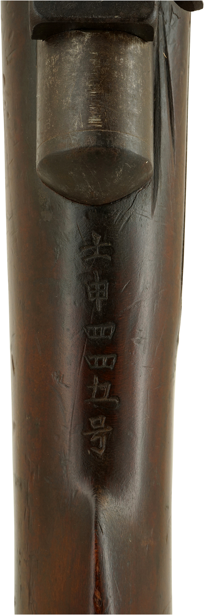 明治4年に明治陸軍は主力小銃の統一化を図る為、旧藩に残る銃砲の種類、挺数の把握が急務となりました。 翌明治5年 (1872年、壬申) 1月から、太政官布告第28号第五則の「銃砲取締規則」によって、私蔵されていた銃砲の「我が国初の管理統制」が始まりました。 廃藩時に旧藩は旧家臣に軍用銃を下付した事例が多く見られ、旧士族の家には一挺の軍用銃があったとも言われています。 それらの銃はその後市中に大量に出回り私蔵されていました。 銃砲取締規則ではこれらの私蔵されていた銃砲について、管轄庁 (東京と大阪は武庫司) に持参して改刻印式によって番号、官印を受ける (これが明治5年度であれば壬申刻印と番号) 事が義務付けられました。 同時に管轄庁は同人名と番号を管轄鎮台に届け出て、鎮台より武庫司にそれらが提出される仕組みになっていました。 この調査は明治20年代頃まで銃砲調査が行われましたが、明治5年 (1872年=壬申) の調査が最も大々的に行われ、今日この種類の刻印の内90-95%が壬申の年に行われた事から、古式銃に打たれた漢字の刻印をまとめて「壬申刻印」と呼ばれています。 本品は「敦賀縣」及び「壬申四四五号」の刻印が入っている事から、明治5年に敦賀県に届け出が行われた品である事が判ります。 敦賀縣 (敦賀県) とは、明治4年 (1871年) に越前国今立郡・南条郡・敦賀郡および若狭国一円の区域をもって発足した県で、1873年(明治6年)に足羽県が編入され、その範囲はほぼ現在の福井県全域に相当します。