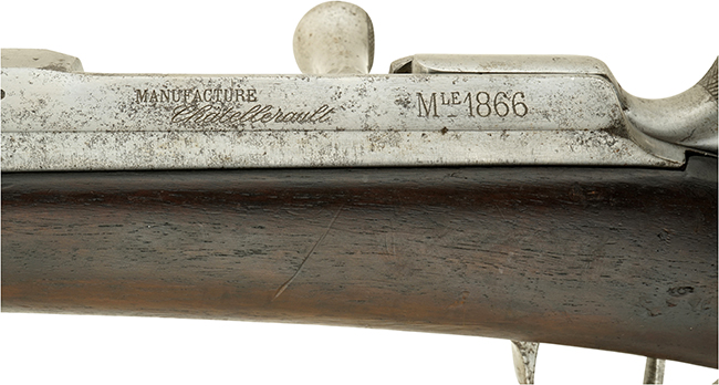 (種別: 紙薬包式銃砲、全長: 131.5cm、銃身長: 80.4cm、口径: 1.1cm、銘文: MANUFACTURE Chatellerault)