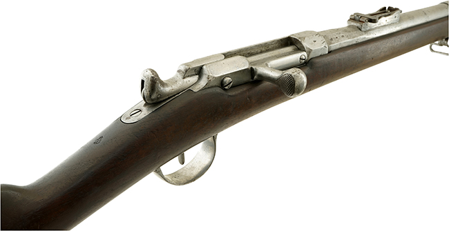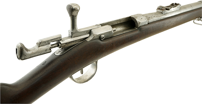 シャスポー ライフルの弾薬は紙巻の特殊弾薬で、紙製の薬莢は発射時に燃え尽きてしまい、排莢する必要はありませんでした。 一見、単発センター・ファイアのボルト・アクション・ライフルに似ていますが、ボルトはボルト・ヘッド、ゴム製の塞環、針のような撃針、撃針バネで構成されています。 シャスポー ライフルは、ドライゼよりもはるかに近代的なボルト・アクションに近いシステムになっています。 ドライゼ・ライフルはガス漏れを抑えるために前装銃よりも弱装の弾薬を使用しており、射程距離が短いという欠点を持っていました。 シャスポー ライフルは、発射時の圧力でボルト・ヘッドが後方に押され、ゴム製の塞環 (リング) が押しつぶされて膨張することによって薬室内壁に密着する構造になっていました。 これにより発射ガスの吹き戻しを防ぐことができ、射手の手や顔が守られました。 火薬と一緒に紙製の薬莢が燃え尽きてボルト・ヘッドにかかる圧力が低下すると、ゴム製の塞環 (リング) は元に戻って密着が解かれ、ボルトを引いて次弾の装填ができました。 このように、膨張と伸縮を繰り返すゴム製の塞環 (リング) は消耗品で、兵士は予備のリング数個と折れやすい針状の撃針を携帯しました。 シャスポー M1866 歩兵銃は非常に有名ですが、1866年から1875年の僅か9年間だけしか生産されていませんでした。 本品はシャスポー 小銃が生産を終了する4年前の1871年に生産された後期型 (2型=2eme Modele) です。(MM)(KK)