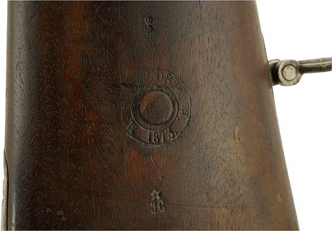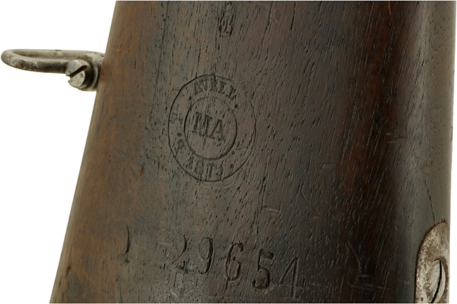 本品はChatellerault造兵廠で製造された品で、機関部左側面には「MANUFACTURE Chatellerault」及び「MLE 1866」のモデル名が入っており、薬室前方の銃身右側には製造年を示す「1871」の刻印が入っています。 銃床右側面には製造年を示す刻印が入っており、1873年10月製となっています。 銃床左側面には1879年4月に再整備された際に打刻されたと思われる円形の刻印が打刻されており、中心部には「MA」の刻印が入っています。 「MA」は「Manufacture d’Armes (国立造兵廠製)」の意味で、1870年に第二帝政が崩壊し第三共和政になってから「MI (Manufacture Imperiale=王立造兵廠製)」 から「MA」に変わりました。 シリアルNo.は、銃身が1247、ボルトが15541、コッキング・ピースが62903、銃床が29654、さく杖が86810となっています。 ボルト・ハンドルは後部にチェッカリングが入った1868年以前のタイプで、コッキング・ピースは後部に切れ込みのない1869年以降のタイプとなっています。
