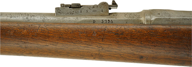 本品は典型的な1型 (1er Modele) のシャスポー Mle 1866 歩兵銃です。 薬室前方の銃身右側には「M.1867」の刻印が入っている事から1867年製である事が判り、さらにシリアル No.の「D 3794」からドイツ国境に近いMutzig (ムツィグ) 王立造兵廠で製造された品である事が判ります。 Mutzig王立造兵廠では、シリアルNo.D20000までが1867年製となっており、本品はシリアル No.がD3794である事から、1867年製の中でも早い時期に作られた品である事が窺えます。 レシーバー左側面には「Manufacture Imperiale Mutzig (ムツィグ王立造兵廠)」の刻印が二行にわたって大きく入っています。 また、銃身後部右側面 (リア・サイト後方の斜め下) には「MI」の刻印が入っていますが、これはフランス第二帝政時代の1870年以前に生産された品に見られるもので、「Manufacture Imperiale (王立造兵廠製)」を意味しています。 薬室部に打刻された「楕円形に王冠とC」及び「楕円形に王冠とM」の刻印の「C」と「M」は、それぞれDirector (現場責任者) 及びController (業務担当者) のイニシャルです。 本品はシリアルNo.が銃身、ボルト・ハンドル、着剣ラグ、銃床でオールマッチしている非常にオリジナル性の高い品です。