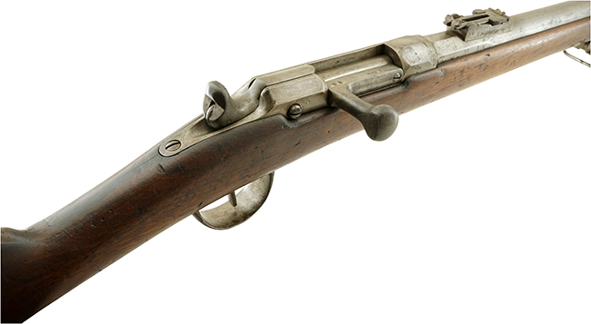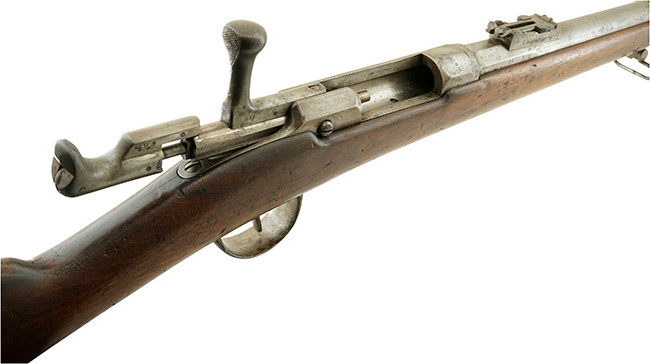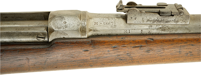 本品は、フランスでシャスポー小銃が採用された翌年 (1867年) に生産された極初期型 (1型、1er Modele) です。 1869年までの1型には、コッキング・ピース後部に大きな切れ込みがあり、さらに1868年まではボルト・ハンドルの後部にチェッカーリングが施されていました。 また、レシーバー後部のアッパー・タングの形状についても、初期型では徐々に幅が狭くなる長い逆二等辺三角形の形状をしていましたが、1869年以降のモデルでは、レシーバーから約1cmの部分まではレシーバーと同じ幅が維持され、その後一段狭くなり、ほぼ一定の幅でタングの先端付近まで伸びる形状に変更されました。 この改良により、木製ストックにかかる負荷を幅広の部分で抑える効果が得られました。 本品は、これらすべての初期型の特徴を備えています。 (KK)(MM)