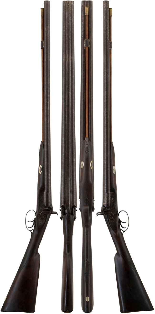 作動については完全で、ハンマーは左右ともにハーフ/フル・コックがしっかりと掛かり、フル・コック位置でトリガーを引くとハンマーが力強く落ちます。 銃身内は銃口から銃身後部まで完全に抜けて (通って) おり、火穴も抜けています。 パーカッション・ニップル及び左側のハンマーの打撃面の縁に一部欠けが見られます。 真鍮製の口金が付いた木製のさく杖が付属いたします。