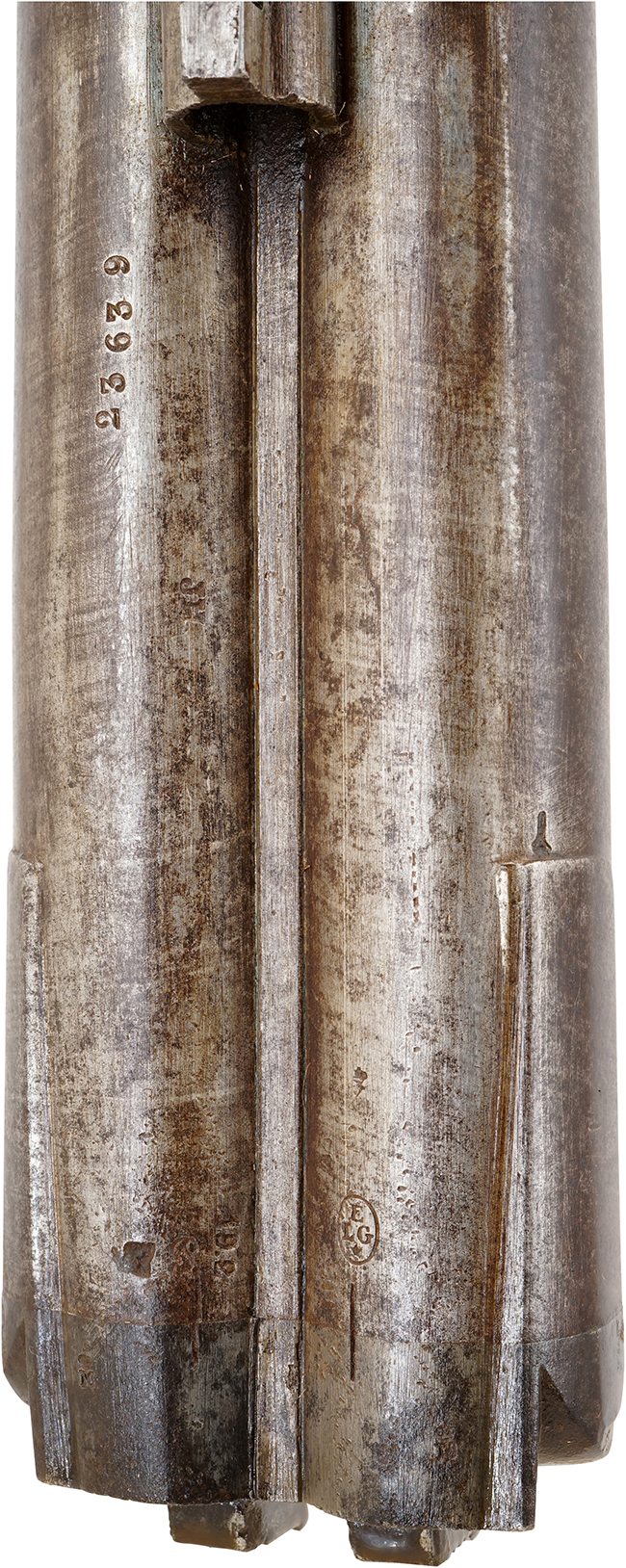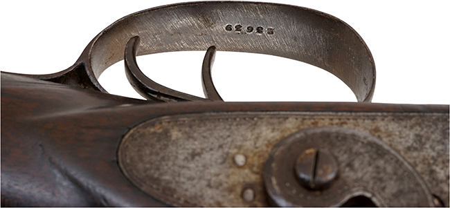 本品の左側の銃身基部下面に楕円内に「ELG」の文字を配したリエージュ プルーフ・ハウスの完成検査刻印が打刻されており、その他にも右側の銃身基部下面にはやや見え難くなっていますが、黒色火薬を用いた仮検査に合格した段階の銃身に打刻される筆記体大文字のEとLが絡み合った仮検査 (Epreuve provisoire) 刻印が打刻されており、右側の銃身基部側面には監督検査 (Controle) を通過した事を示すペロン (Perron) と思われる刻印が確認出来ます。 本品に見られる筆記体EL (仮検査印)、ペロン (監督検査印)、楕円内にELG (完成検査印) は1853年の王令で体系化された刻印群であり、とくに筆記体ELとペロン刻印はこの時に新設されたものです。 ELG刻印自体は1810年から用いられていましたが、1853年以降はこれらと組み合わせて押捺されるようになったため、本品も1853年以降の製造であることが分かります。