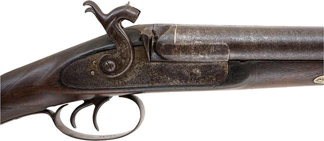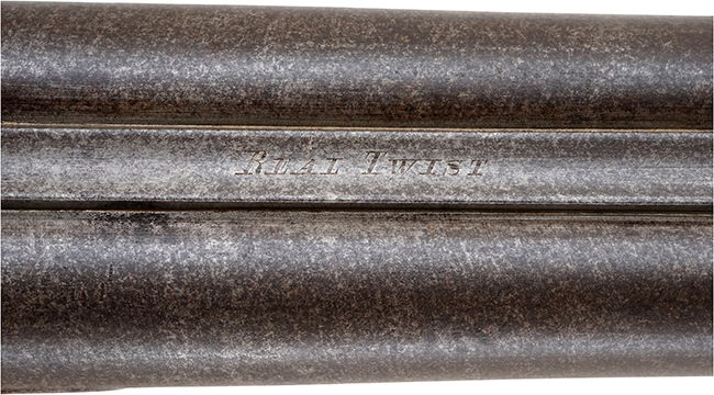 本品の銃身上面には「REAL TWIST」の刻印が入っています。 「REAL TWIST」の刻印は、19世紀のベルギー製をはじめとする古い水平二連ショットガンの銃身に見られる表記で、銃身素材の製法を示しています。 Twist バレルとは、軟鉄と鋼の帯をねじり合わせて鍛接し管状に成形したダマスカス銃身の一種であり、美しい模様と弾力性を備える事から黒色火薬時代の散弾銃に広く用いられました。 「REAL」という語は当時の広告的要素を含み、表面だけダマスカス模様を施した粗悪な銃身との差別化を意図したものと考えられています。 リエージュの銃身メーカーや輸出業者は、「REAL TWIST」や「GENUINE LAMINATED STEEL」「FLUID STEEL」といった表示を銃身に刻み、素材の種類と品質を示しました。 こうした表示は1850年代以降のベルギー王立プルーフ・ハウス規程やイギリス・バーミンガムやロンドンのプルーフ規程にも沿うものであり、当時の国際市場に向けたカタログにも数多く記載が見られます。