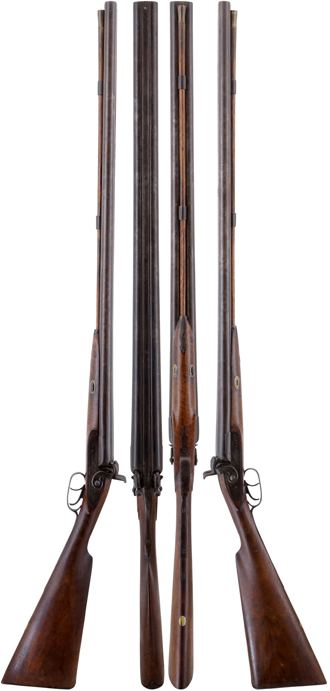水平二連ショットガンは、18世紀頃のフリント・ロック式 (燧石式、火打石式) ショットガンに起源を持ち、狩猟用として広く普及した、伝統ある形態の散弾銃です。 二本の銃身を水平に並べた構造は、飛翔する鳥や野生動物を効率的に射撃する為に最適化された形であり、今日に至るまでショットガンの基本形として親しまれています。 技術的な発展においては、まずフリント・ロック式から始まり、より確実な管打式 (パーカッション式) へと進化しました。 さらに19世紀にはピン・ファイア式弾薬の発明によって後装式が一般化し、最終的には安全性と信頼性に優れたセンター・ファイア式弾薬の導入により、現代的なショットガンの基礎が築かれました。 18世紀末から19世紀前半にかけて、水平二連ショットガンには美しい縞模様を持つダマスカス銃身が広く用いられ、特に高級散弾銃の象徴となりました。 しかし、19世紀後半には、より均質で強度に優れた近代的な鋼材が普及し、ダマスカス銃身は次第に姿を消していきました。 1870年代には操作性に優れるハンマー・レス式の機構も確立されました。 このようにフリント・ロックからパーカッション・ロック、その後米国以外のヨーロッパではピン・ファイア、そして最後にセンター・ファイアと撃発機構は発展を遂げましたが、基本的な構造は左右にサイド・ロックを備えた外観となっています。 しかしながら、水平二連は左右に銃身を配置する構造上、照準点が僅かにずれるため、遠距離での精度に制約があり、また銃身の幅が広がる事で視界がやや制限されるといった実用上の弱点が存在しました。 そのため、20世紀初頭に入ると、上下に銃身を配置した上下二連式のショットガンが登場しました。 上下二連ショットガンは視界が広く、照準の自然さや反動の分散に優れるため、射撃精度が向上するといったメリットがあり、クレー射撃など競技射撃の分野では次第に主流となっていきました。 それでもなお、水平二連ショットガンは独特のクラシックな外観と欧州における伝統的な狩猟文化との結びつきにより、現在でも多くの愛好家に支持されています。
