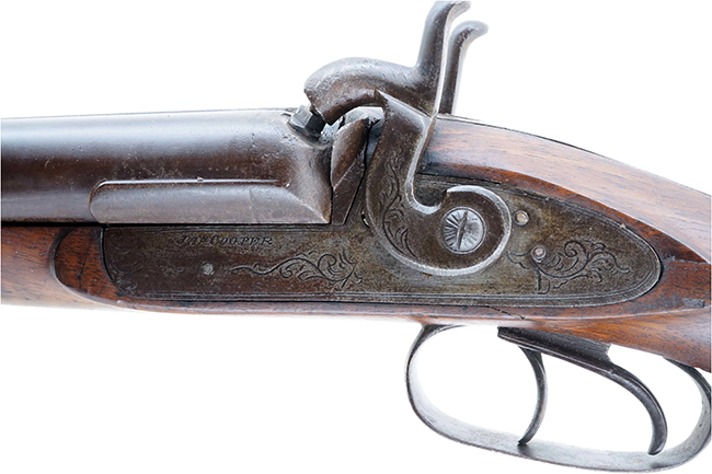 本品は英国のJ. Cooper社が製造した品で、左右のサイド・ロックには「JAS COOPER (Sは小文字)」のメーカー刻印が入っており、「JAS」とはJamesの省略形であると考えられます。 また、左右の銃身の間に設けられたリブ (Top Rib) には「LONDON FINE TWIST」の刻印も確認出来ます。 「LONDON FINE TWIST」とは、当時の慣用的な宣伝文句で、本品の銃身がねじり鍛接により製造された高品質なダマスカス銃身である事を謳っています。 同時代の英国製管打式ショットガンとしては、他にも「J. R. COOPER」銘の品が存在しますが、これはJoseph Rock Cooper社が製造したもので、本品を製造した「JAS (James) COOPER」社とは別のメーカーと考えられます。