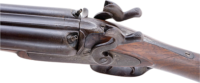 本品の銃身はラウンド形状の銃身を左右に並べたものとなっており、1本のバレル・ウェッジにより銃床に固定される構造となっています。 銃身下部には鉄製のラム・ロッド・パイプを備えています。 トリガーは左右のハンマー用に1本ずつ設けられており、前方のトリガーで右側、後方のトリガーで左側のハンマーの撃発を行います。 サイド・ロックは英国製らしいバー・ロック (Bar Lock) と呼ばれるスタイルとなっています。 左右の銃身基部の下側にはドリップ・バー (Drip Bar) と呼ばれる棒状の部品を備えており、これにより銃身とサイド・ロックの位置を合わせて保持するとともに、銃身の接触面が補強されています。 また、ロック・プレート上部に木部 (銃床の一部) が存在しない構造により、パーカッション・ニップルから発生する火薬の燃焼ガスに木部が頻繁に晒されて焦げるのを防ぐ事も出来ました。 バー・ロックは主に銃床の銃身保持部分が少ないハーフ・ストックのライフルに使用され、英国のロンドンやバーミンガムの多くの著名な銃器製造業者の他、米国の有名な銃器製造業者であるセントルイスのH.E.ディミック (H. E. Dimick) 等が使用した事で知られています。 (KK)