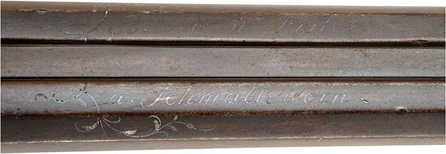 本品の銃身上面には非常に薄くなっており判読が難しくなっていますが、「B. & E.W. Pistor」のメーカー名及び「Schmalkalden」の地名が銀象嵌により入っています。